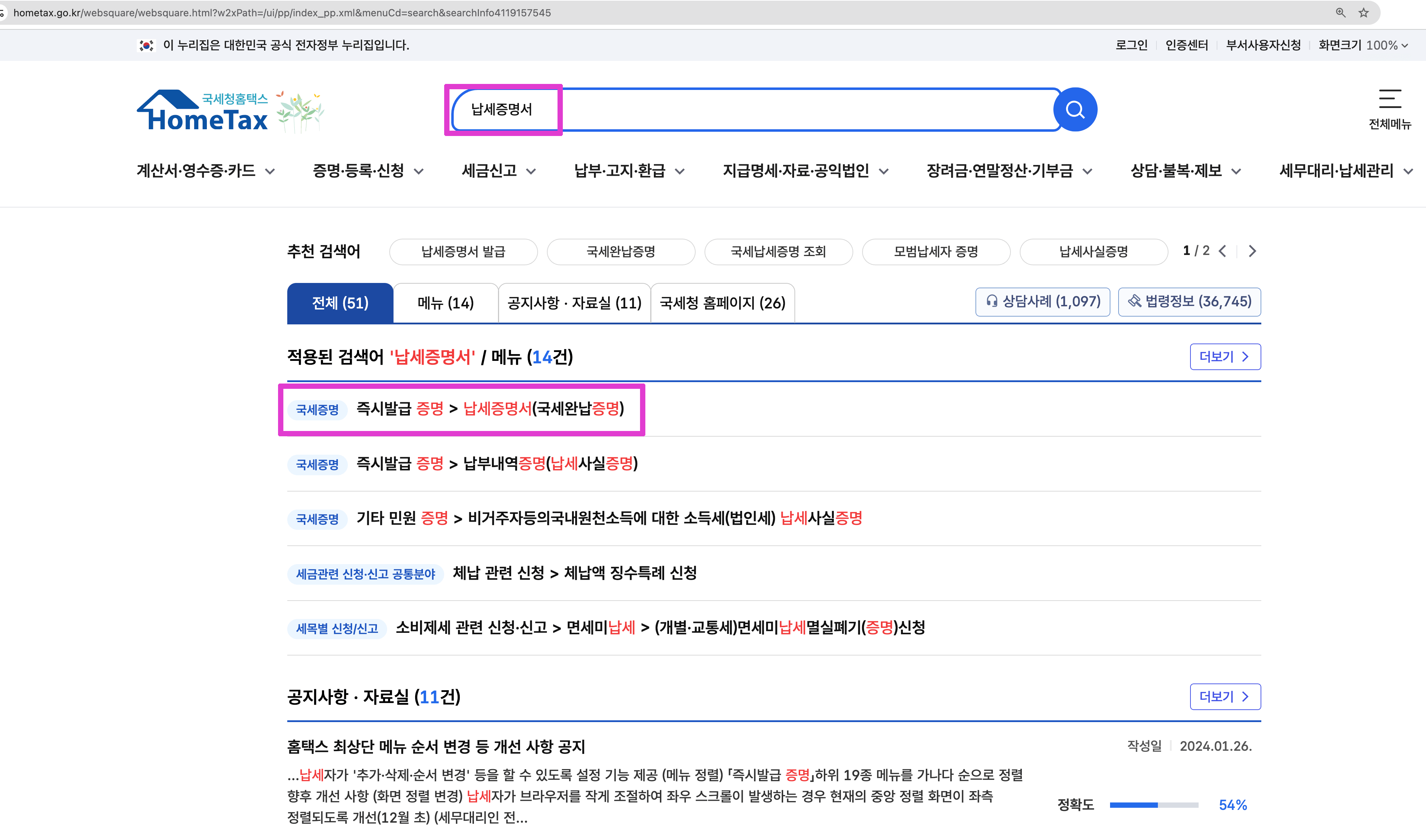 - '국세증명' 메뉴에서 '납세증명서' 선택