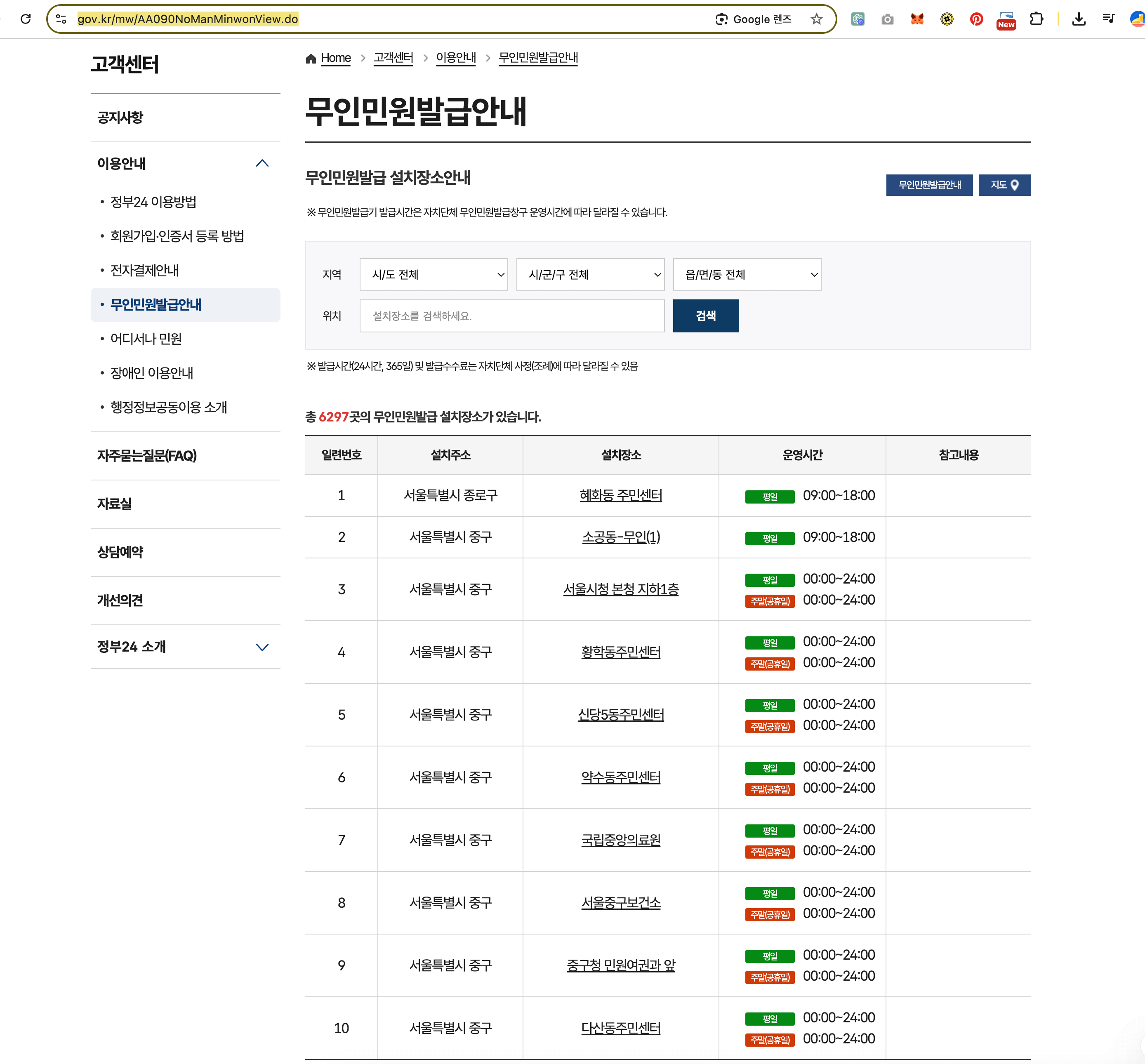 - 무인민원발급기 위치는 정부24 사이트에서 확인 가능