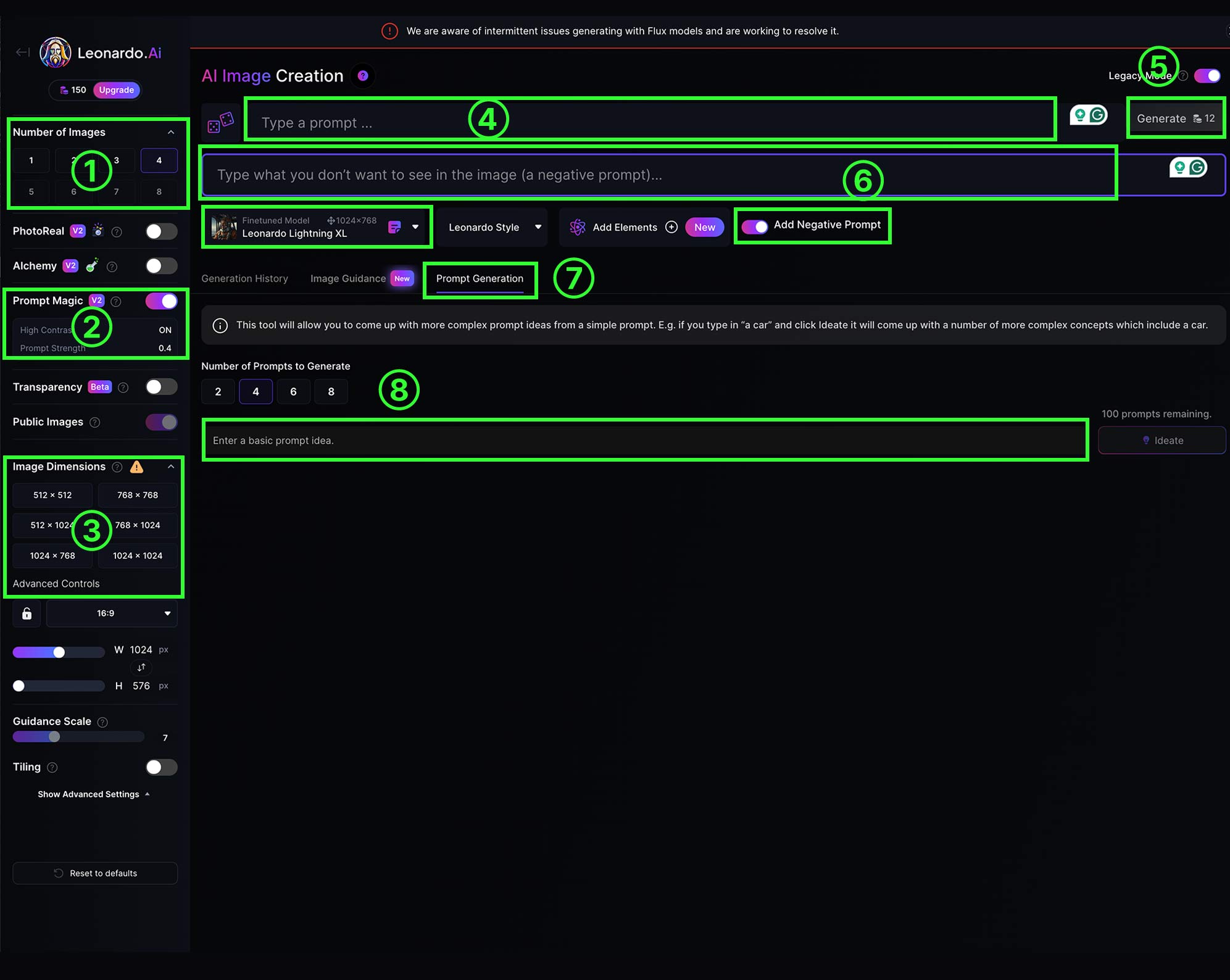 - ⑦ Promt Generation : 레오나르도 AI에서 Prompt Generation은 사용자가 쉽게 이미지를 만들 수 있도록 돕는 기능입니다. 이 기능은 사용자가 원하는 이미지에 대해 입력할 내용을 고민하는 대신, AI가 자동으로 프롬프트를 제안해 줍니다. 간단히 말해, 사용자가 입력한 키워드나 주제를 기반으로 더 구체적이고 풍부한 프롬프트를 생성해 주는 것이죠. 이렇게 하면 창작 과정이 더 간편해지고, 원하는 이미지를 얻는 데 도움이 됩니다. 원하는 스타일이나 내용에 맞게 AI가 프롬프트를 생성하니, 창의력을 발휘하기에 좋은 도구가 됩니다!