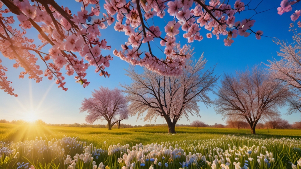 1) 봄에 관련된 키워드: spring, blooming, fresh, vibrant, renewal, sunny, clear sky, morning light