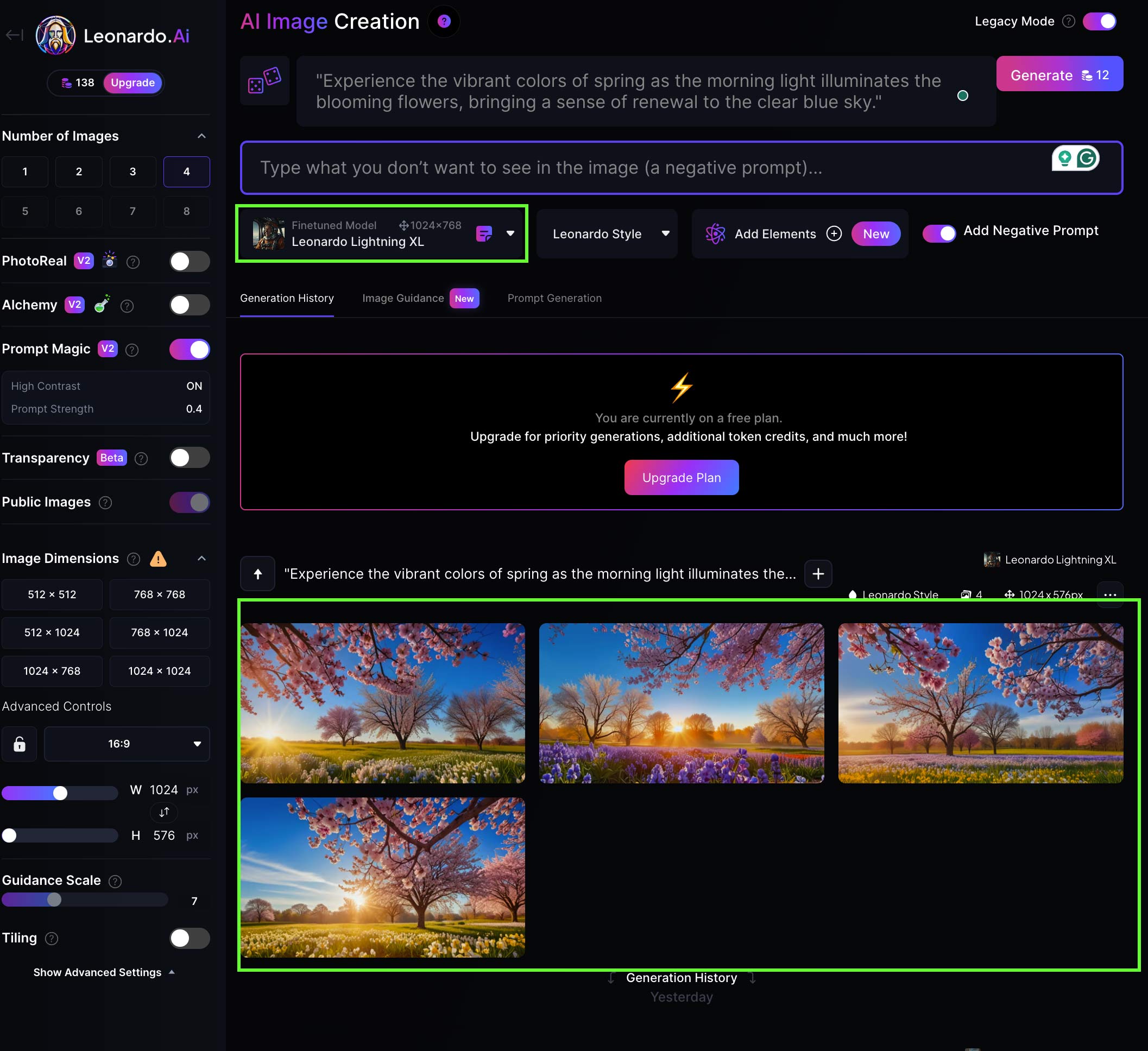 - Lightning 기능 활용: 이미지 생성 속도를 높이기 위해 'Leonardo Lightning' 기능을 활성화합니다.