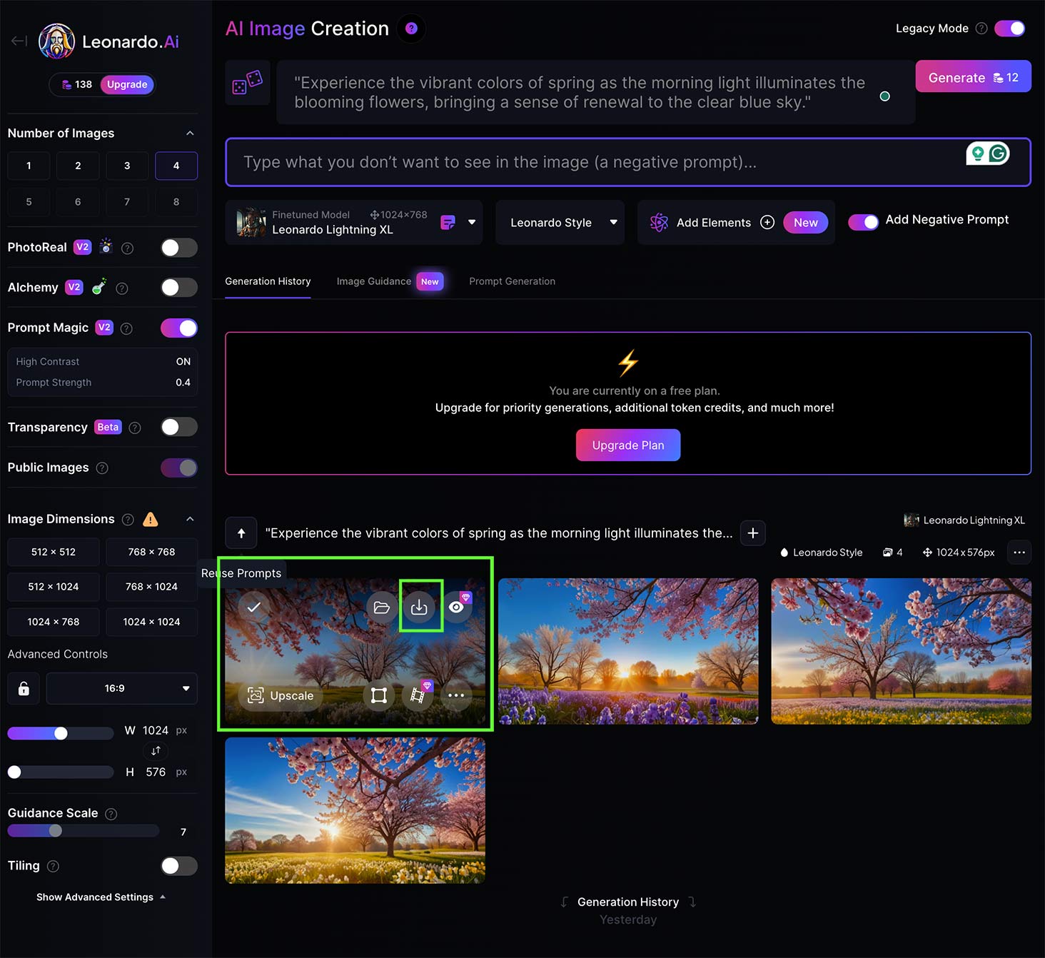 생성된 레오나르도 이미지를 다운로드하려면 이미지 위에 마우스로 올려놓으면 다운로드 버튼이 보이게 됩니다. 사이즈는 1024x768 크기로 다운로드할 수 있습니다. 사이즈를 더 크게, 선명하게 만들기 위해선 Upscale을 사용하시면 됩니다.(유료버전)