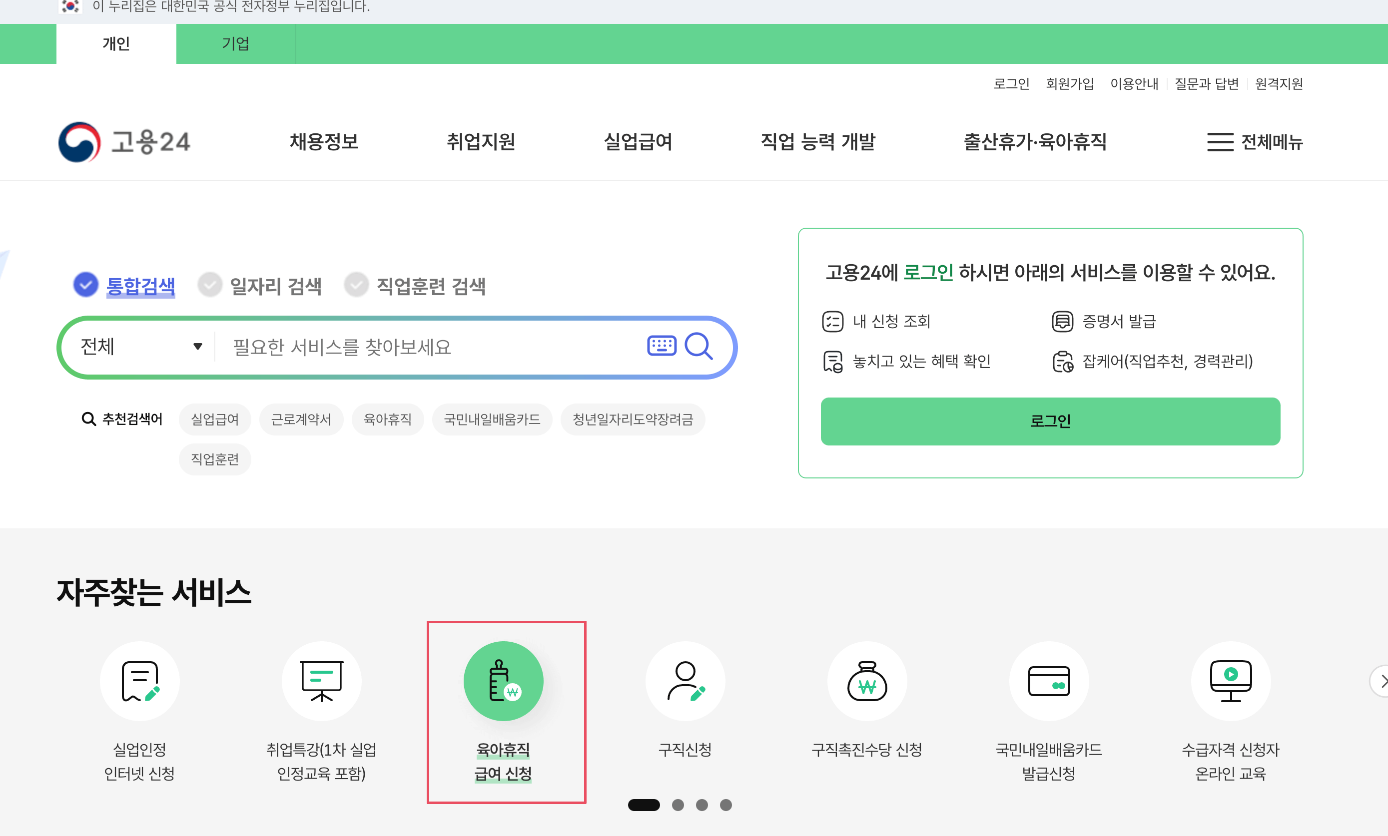 - 육아휴직 개시일 이후 1개월이 지나면, 고용보험 홈페이지(고용보험 누리집) 또는 가까운 고용센터에서 육아휴직 급여를 신청합니다.