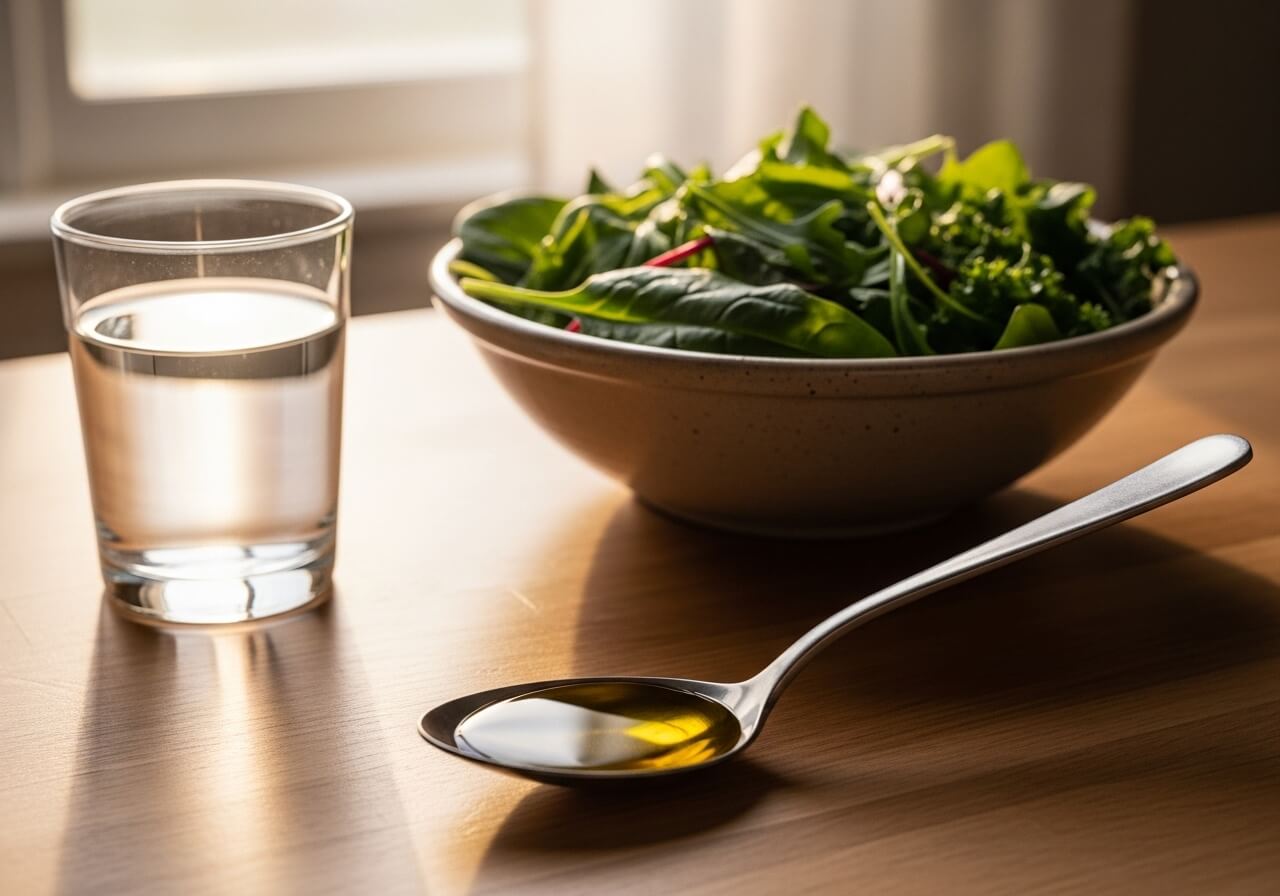 공복에 EVOO를 섭취하면 다른 음식 성분의 간섭이 적어 폴리페놀과 비타민 E가 상대적으로 효율적으로 흡수됩니다. 이 성분들은 체내 활성산소(ROS)를 줄이고 염증 반응을 완화하는 데 관여하며, 그 결과 세포 손상 지연, 피로 회복, 면역 균형 유지에 도움을 줄 수 있습니다.