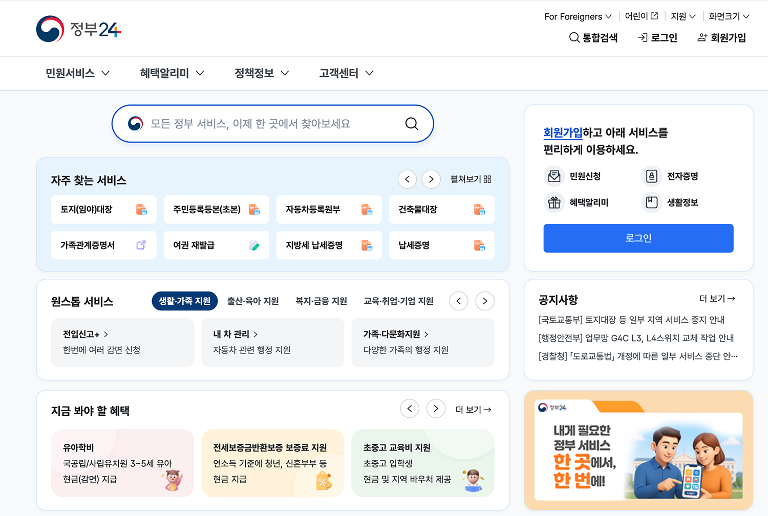 - 정부24 접속 → 본인 인증 → 신청서 작성 → 서류 업로드 후 신청 완료